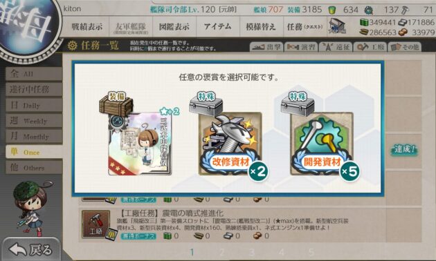 選択報酬は「改修資材」と「伊良湖」にしました。