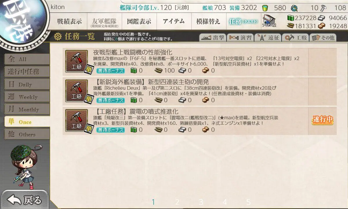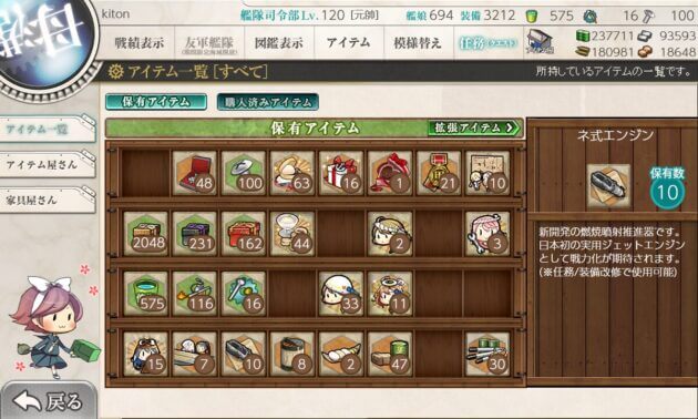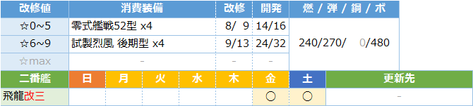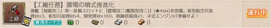 | 2. 準備 | ・新型航空兵装資材 x3 ・新型兵装資材 x4 ・熟練搭乗員 x1 ・ネ式エンジン x1 ・開発資材 x160 |