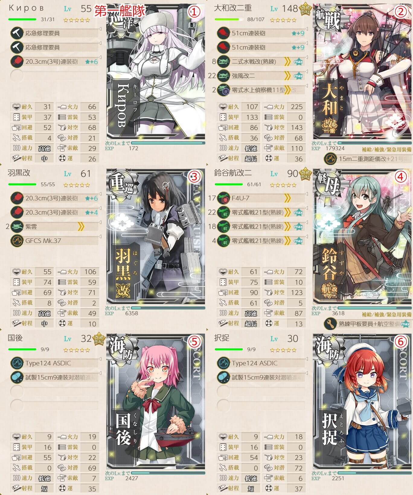 • 海防艦 x2 , 戦艦級 x1 , 航空母艦 x1 , 重巡級 x1 , 軽巡級 x1