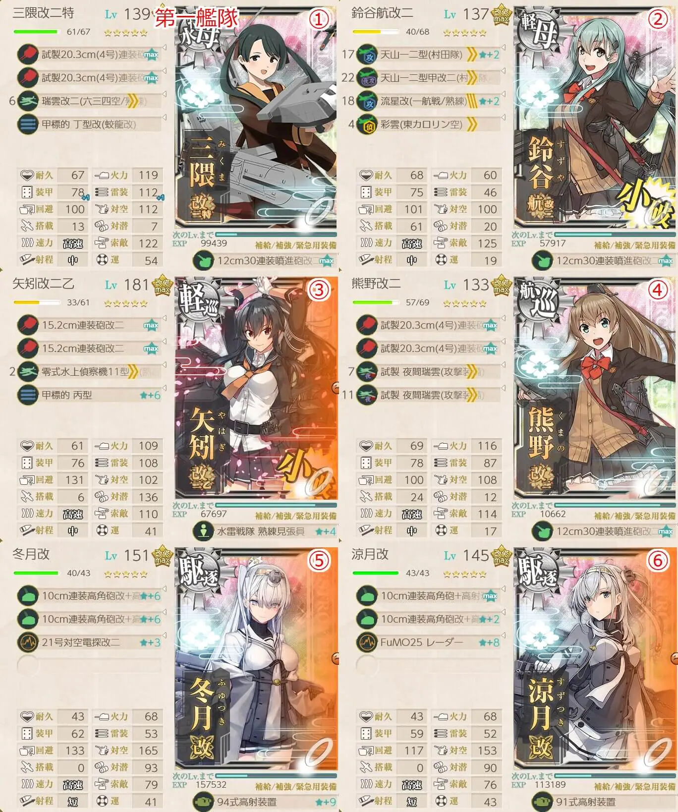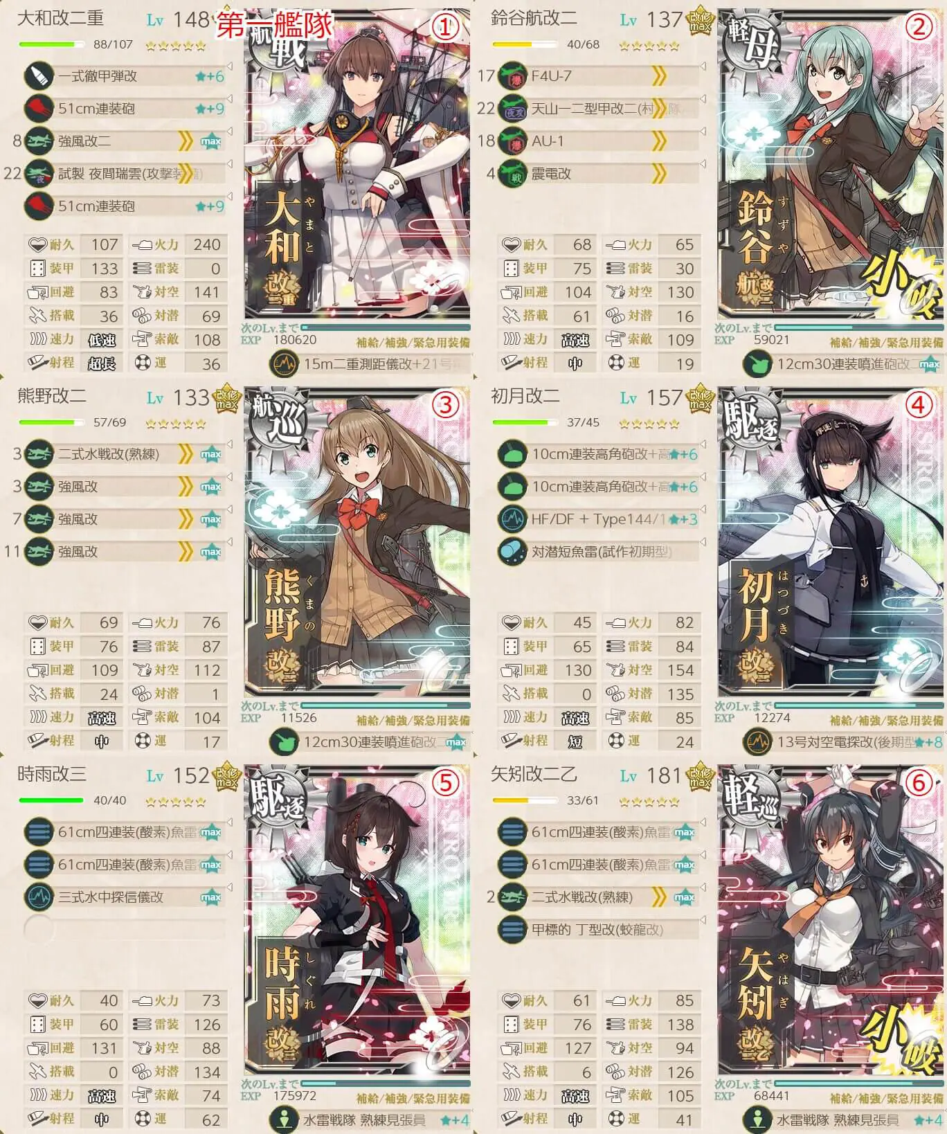 • 鈴谷 x1 , 熊野 x1 , 矢矧 x1 , 戦艦級 x1 , 駆逐艦 x2