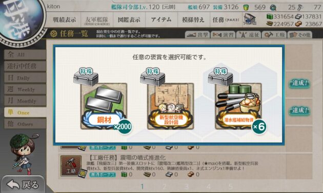 選択報酬は「装備運用枠」と「新型航空機設計図」にしました。