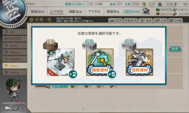 選択報酬は「改修資材」にしました。