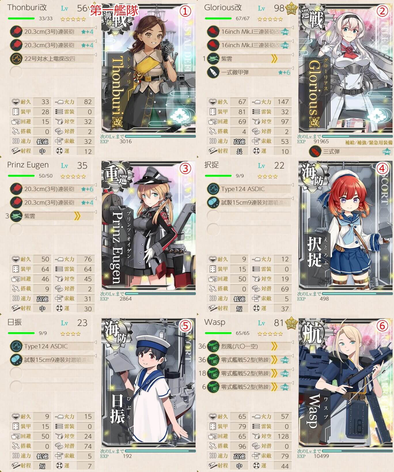 - 海防艦 x3 , 戦艦級 x1 , 重巡級 x1 , 航空母艦 x1