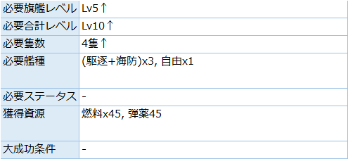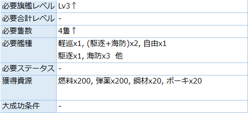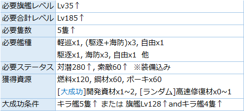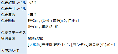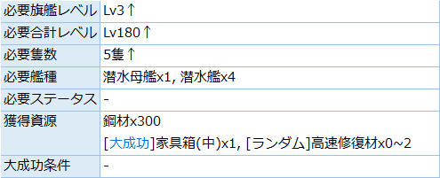 | ・01:30 – 05. 海上護衛任務 ・00:25 – A1. 兵站強化任務 ・02:15 – A3. 長時間対潜警戒 ・04:00 – 09. タンカー護衛任務 ・30:00 – 39. 遠洋潜水艦作戦 |