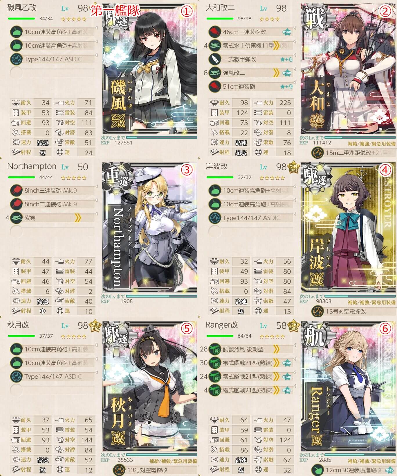 - Ranger x1, 磯風 x1, 岸波 x1, 秋月 x1, 戦艦級 x1, 重巡級 x1