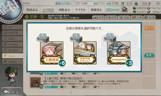 選択報酬は「戦闘詳報」と「工廠資源」にしました。