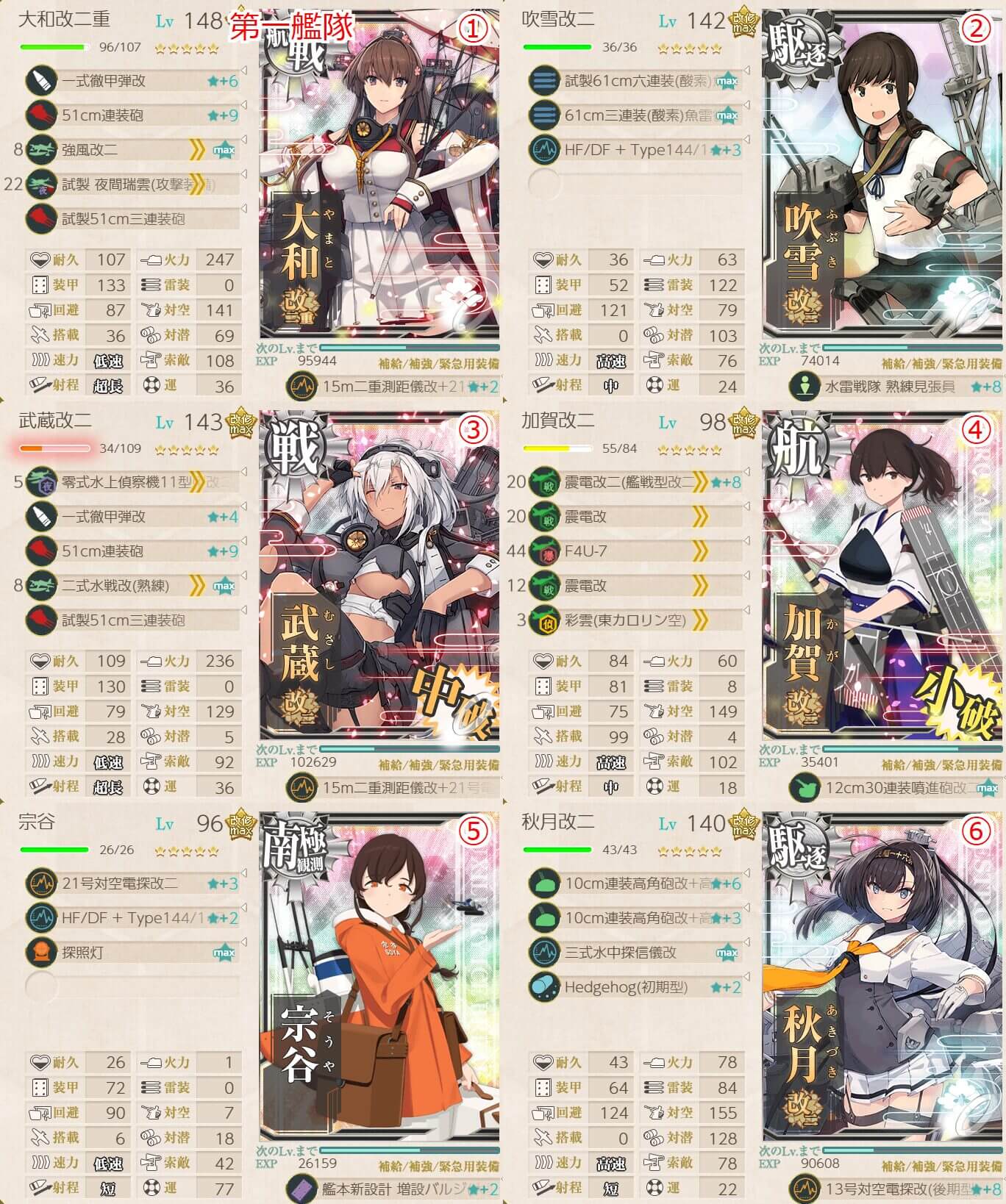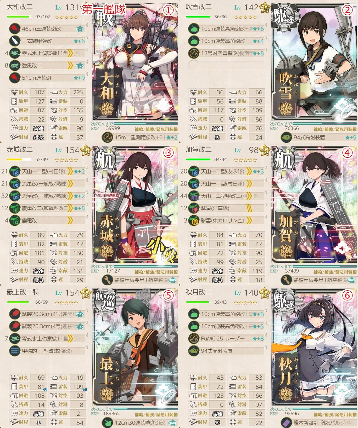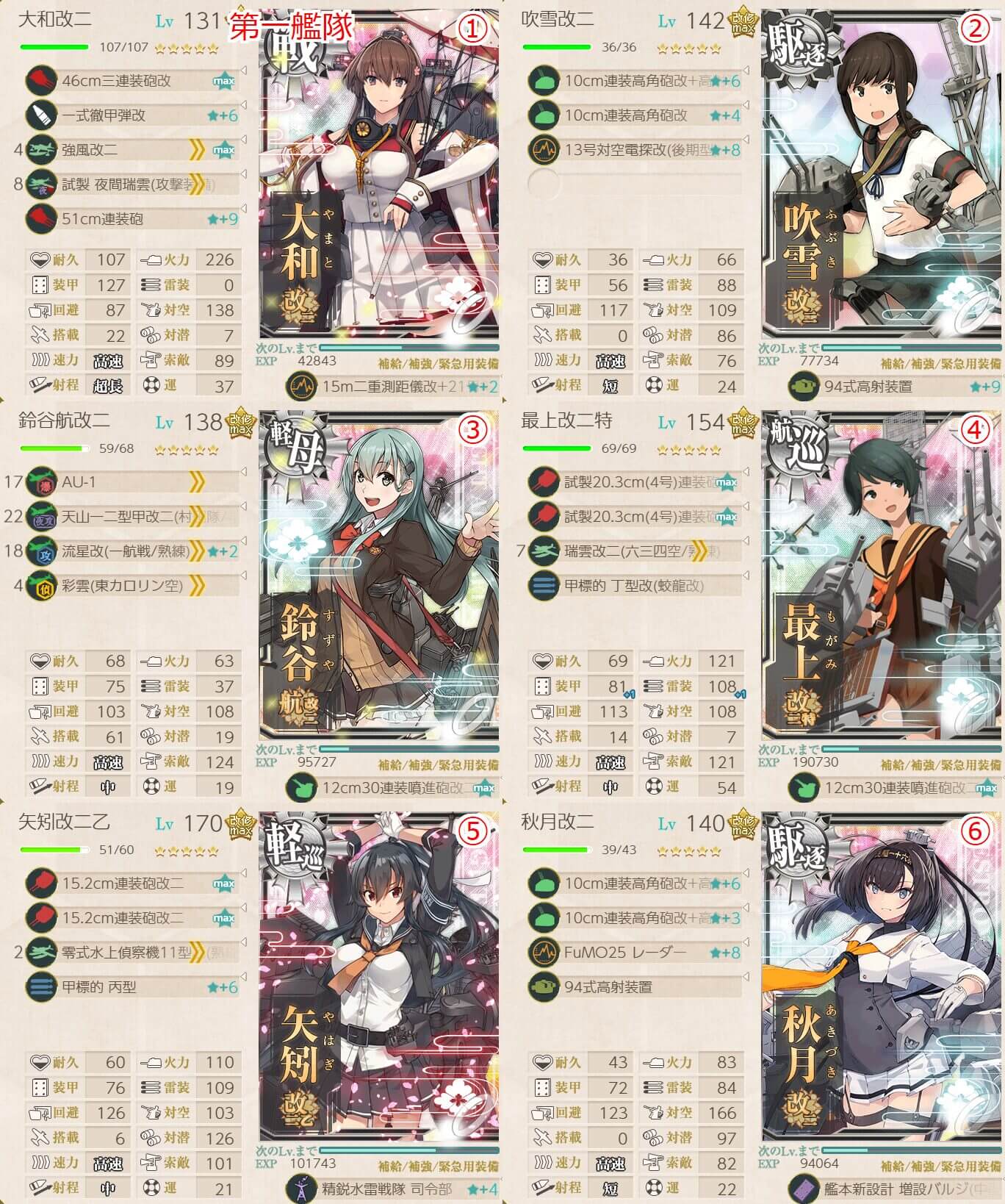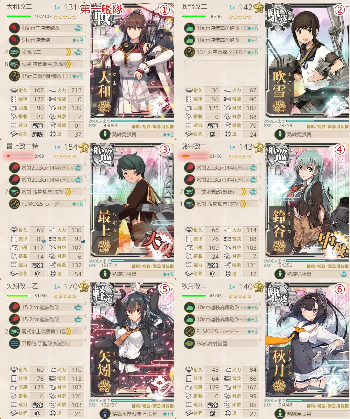 • 大和 [旗艦] , 吹雪 [二番艦] , 軽空母 x1 , 重巡級 x1 , 軽巡洋艦 x1 , 駆逐艦 x1