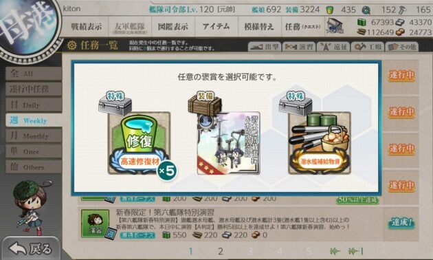 選択報酬は「潜水艦補給物資」と「勲章」にしました。