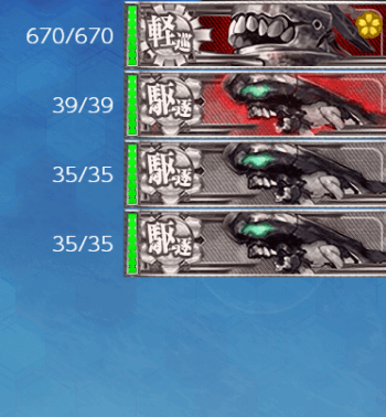 - 戦艦級 x1 , 航空母艦 x1 , 重巡洋艦 x1 , 軽巡洋艦 x1 , 駆逐艦 x3