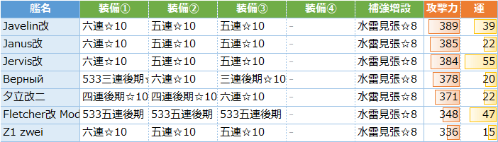 - 軽巡洋艦 x1 , 重巡級 x1 , 駆逐艦 x4