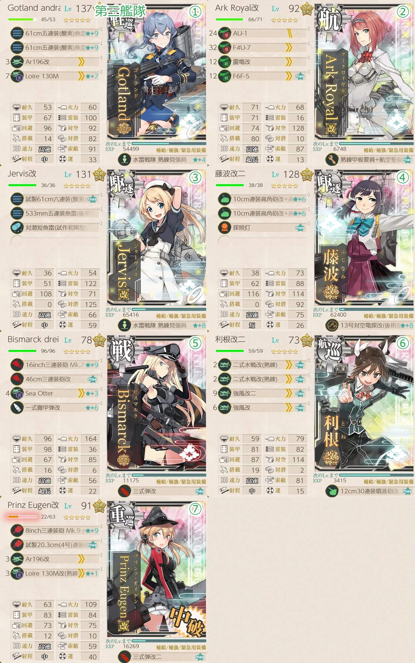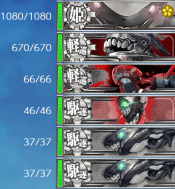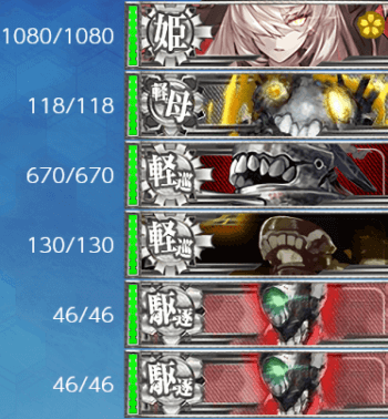 - 戦艦級 x1 , 航空母艦 x1 , 重巡級 x2 , 軽巡洋艦 x1 , 駆逐艦 x2