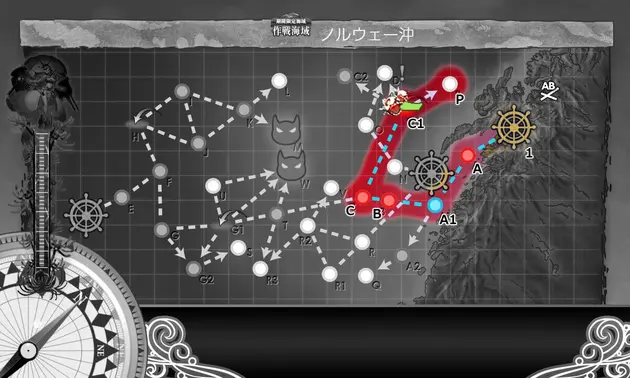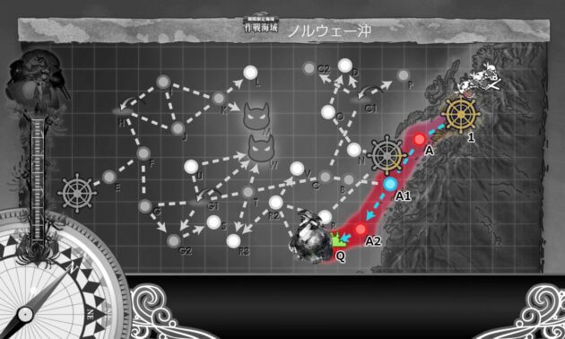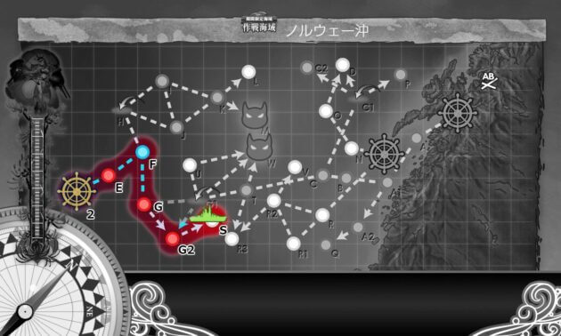 空襲戦が発生するG1マスへ逸れてしまうため注意が必要です。 - また、軽巡洋艦が退避すると、自艦隊の位置に関わらず、