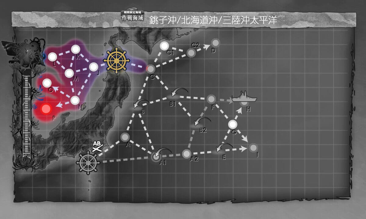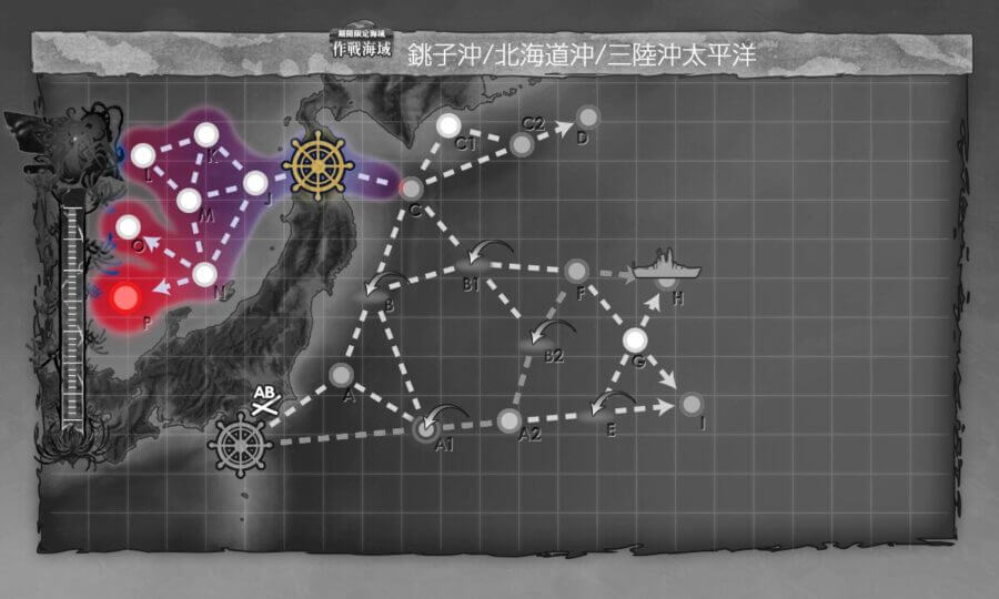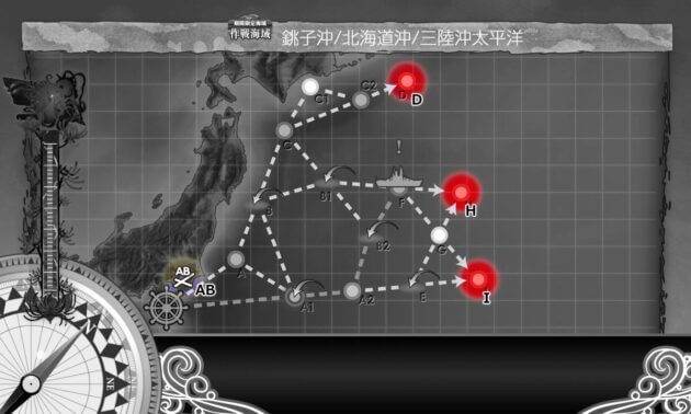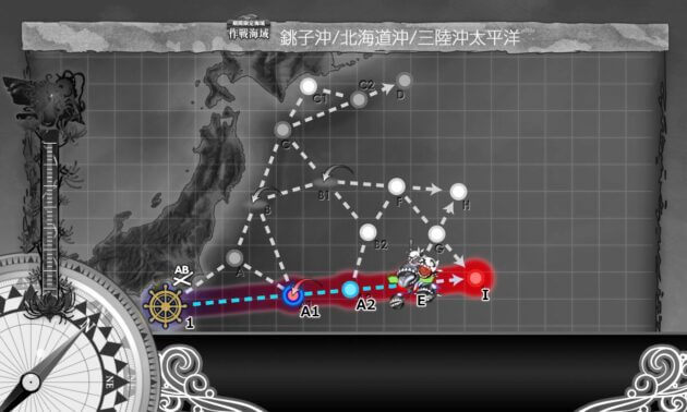 空襲戦が発生するB1マスへ逸れてしまうため注意が必要です。 - C2マスに到達する前に軽巡洋艦がいなくなると、