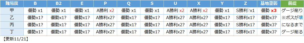 丙ですがB2とSは制空確保しても鳴りませんでした。あとXはA1回でも鳴りました。あとは表の通りでした。